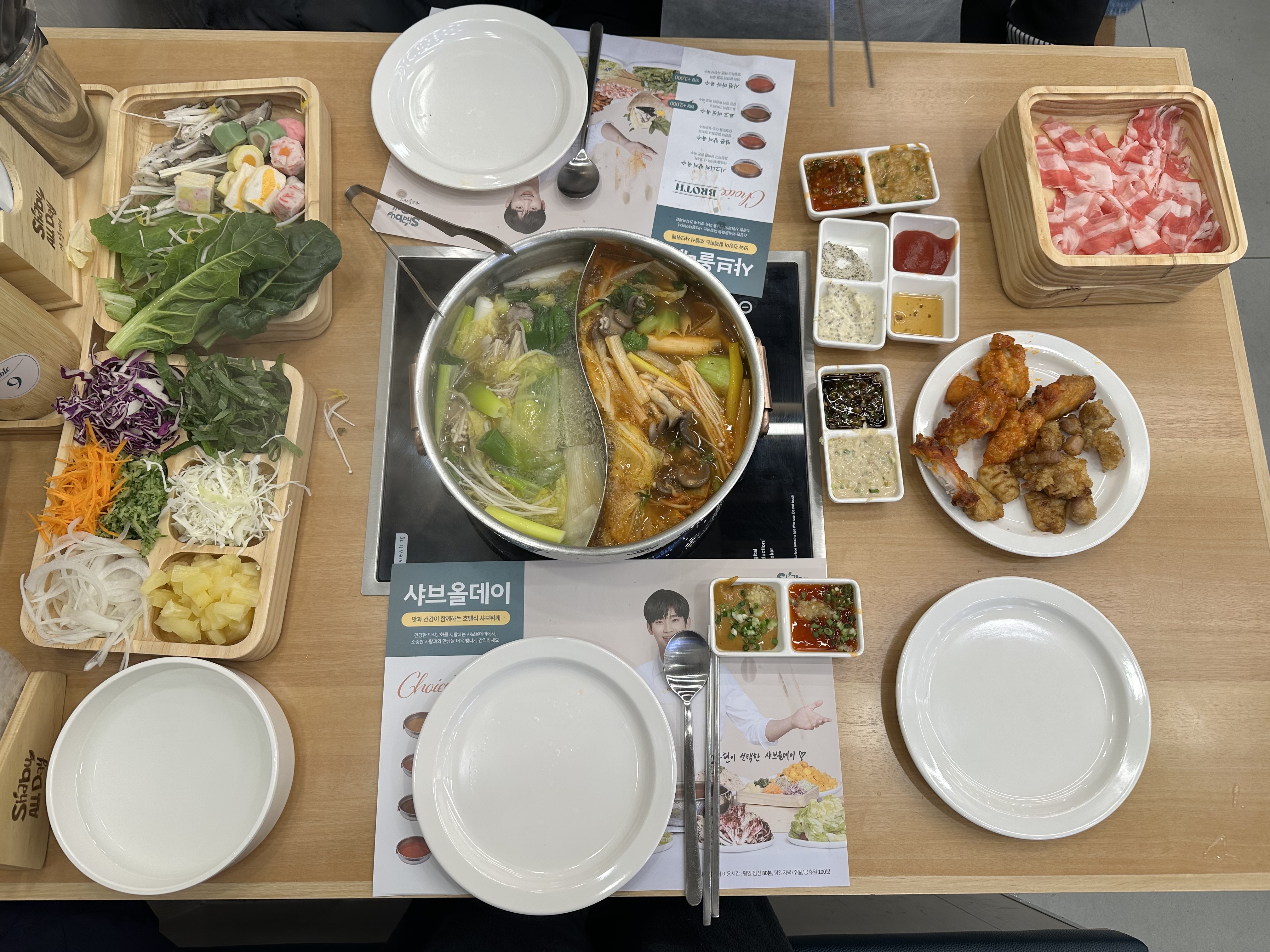 - 샤브샤브: 소고기 무한리필, 양지육수, 얼큰육수, 마라육수 선택 가능