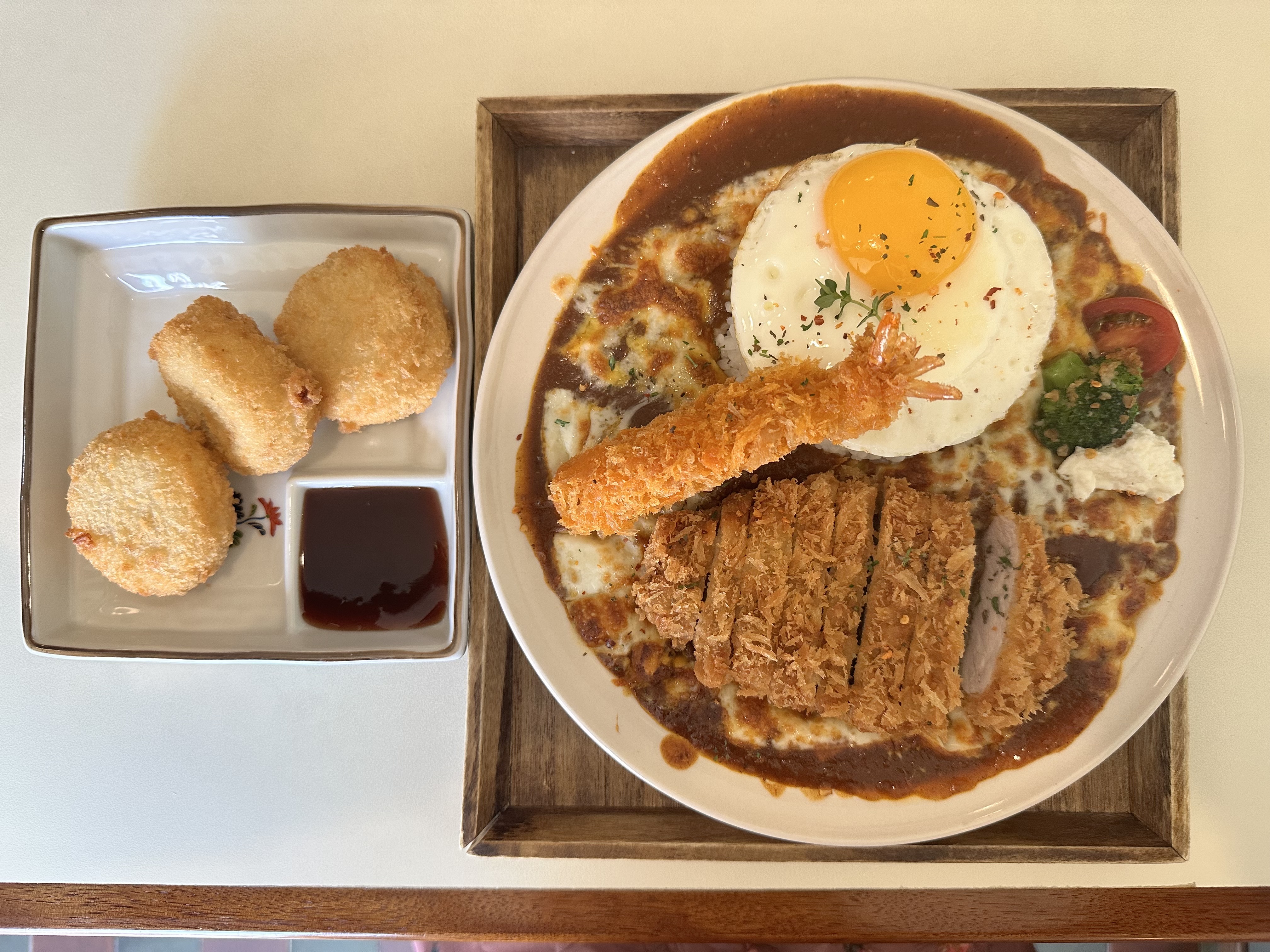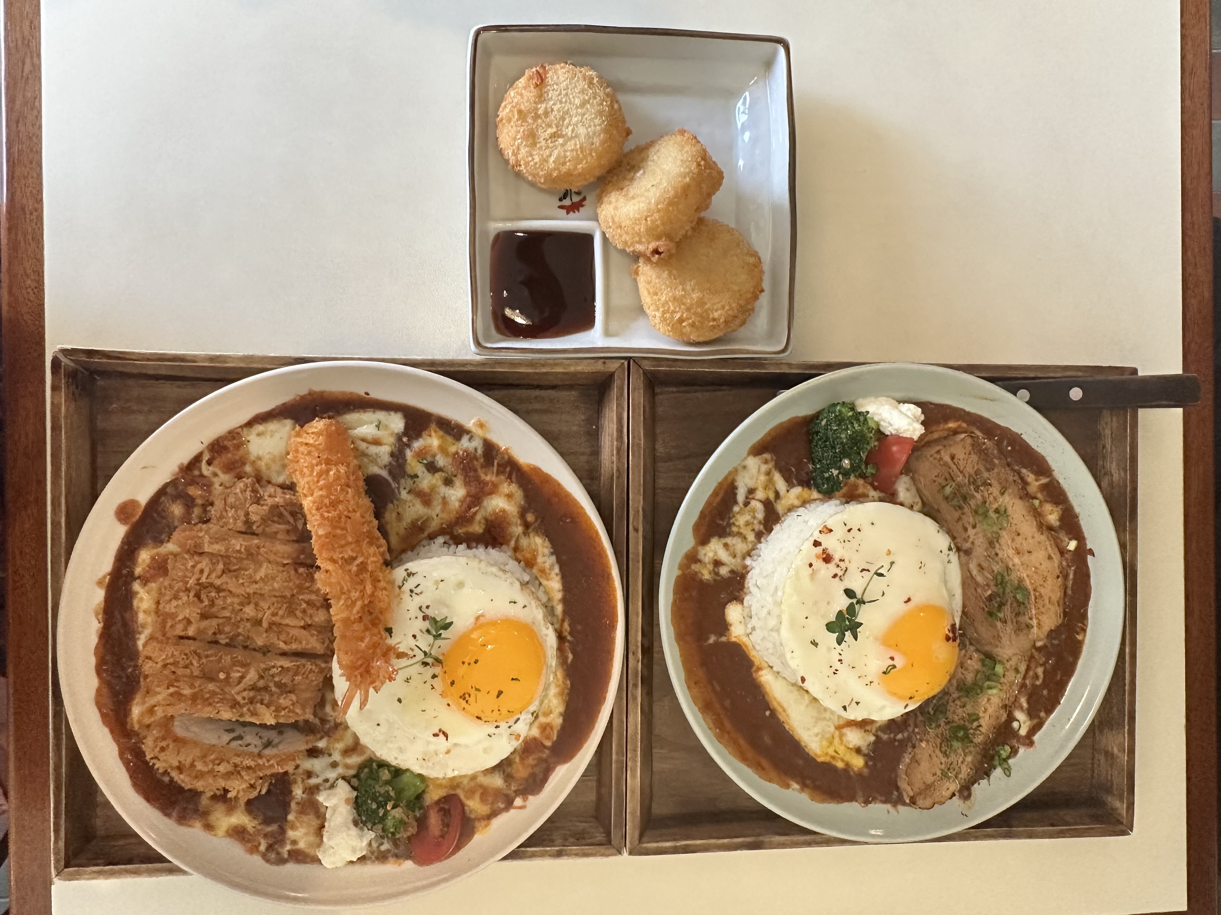 오픈 시간인 11시에 딱 맞춰 갔는데 이미 웨이팅이 있더라고요. 식전으로 제공된 감자와 버터 조합이 인상 깊었고, 야끼에비카레는 진한 치즈와 새우가 어우러져 풍미가 멋졌어요. 야끼차슈카레도 육즙 가득한 차슈와 카레의 조화가 훌륭했습니다. 카레와 밥 모두 무료 리필 가능해서 만족스러웠어요. 사진에는 없지만 감자고로케도 주문해보았었는데 바삭한 튀김과 부드러운 감자가 어우러져 너무 맛있었습니다. 방문하게 되면 함께 주믄하시는 걸 추천드려요!