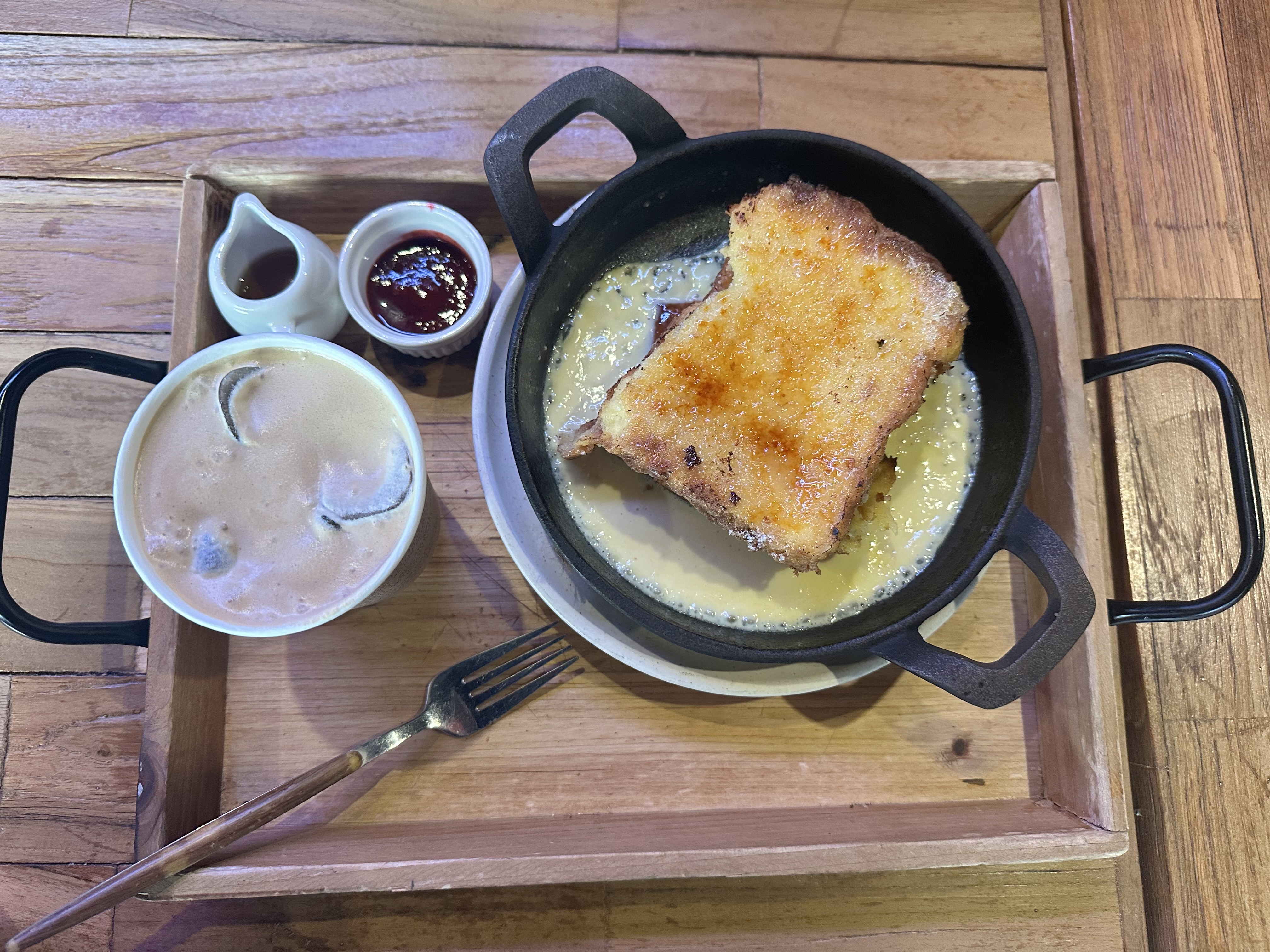 부드러운 식빵 위에 달콤한 커스터드 크림이 올라가고, 겉은 바삭한 크림브륄레 스타일로 캐러멜라이징되어 있습니다.