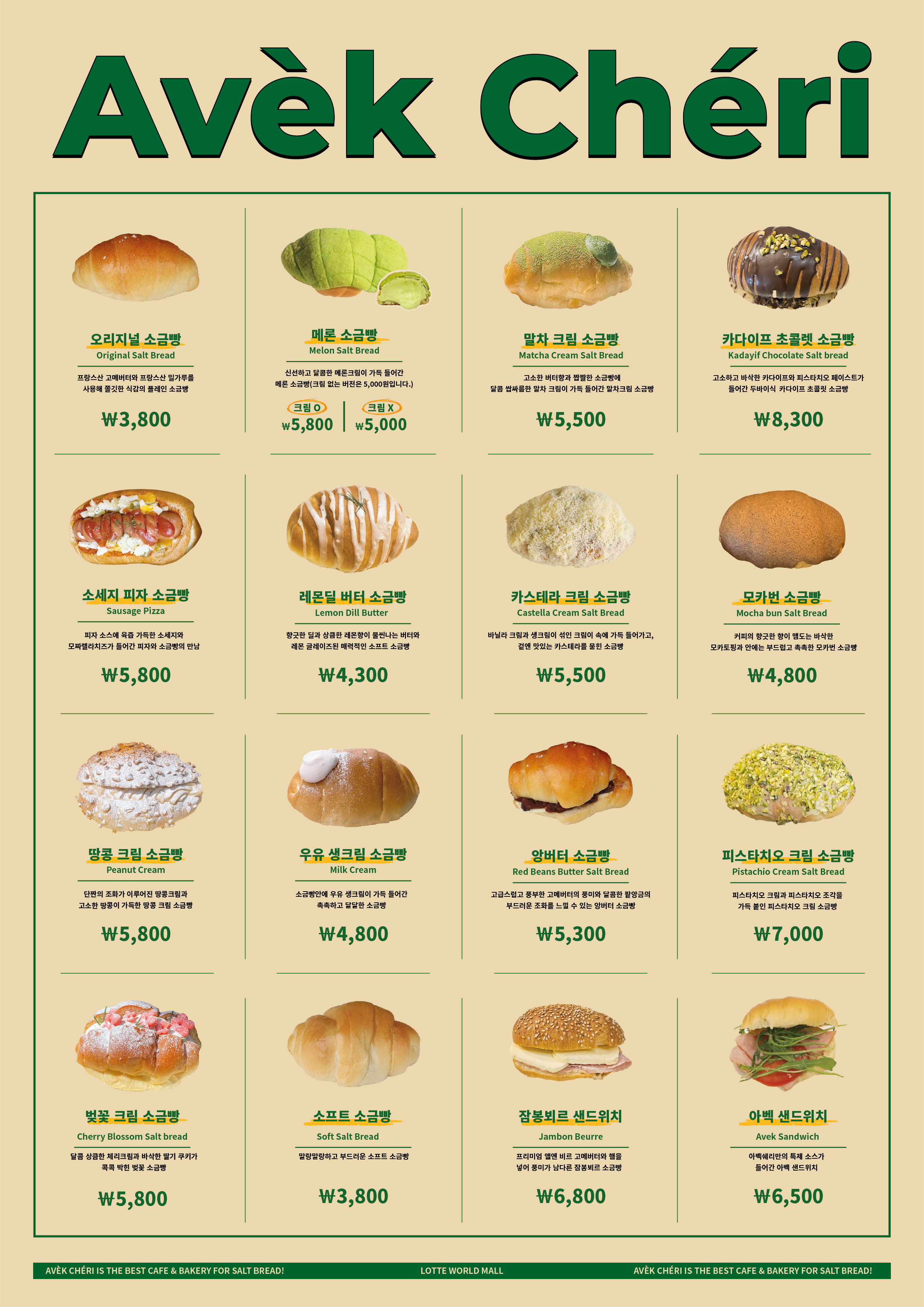 - 메론 소금빵: 달콤한 멜론향과 짭조름한 풍미가 잘 어우러져요.