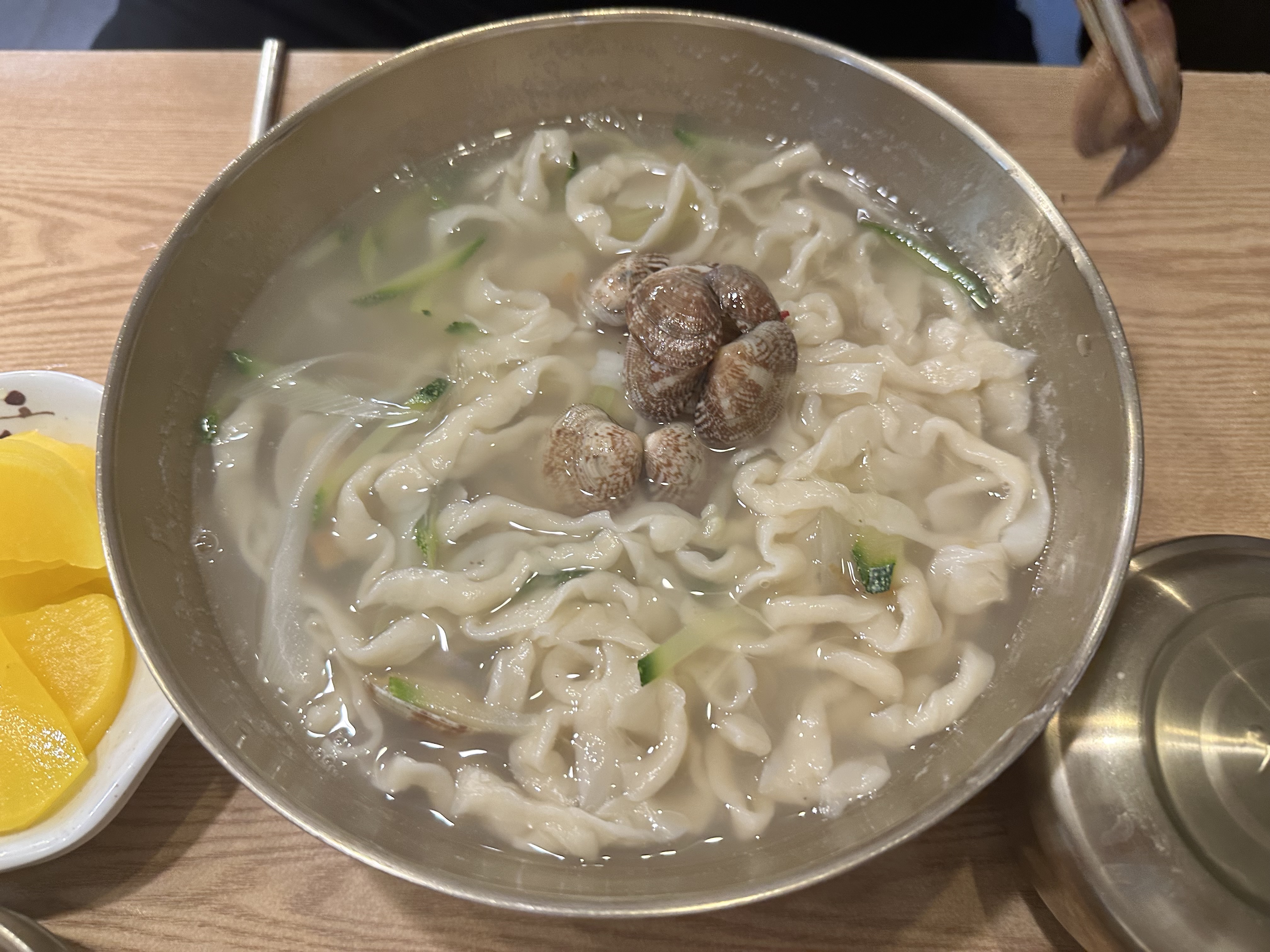바지락 칼국수는 시원한 국물 맛이 매력인데, 제가 너무 배고파서 먹다가 찍은 사진에는 바지락이 적어 보이지만 실제로는 꽤 많았습니다.