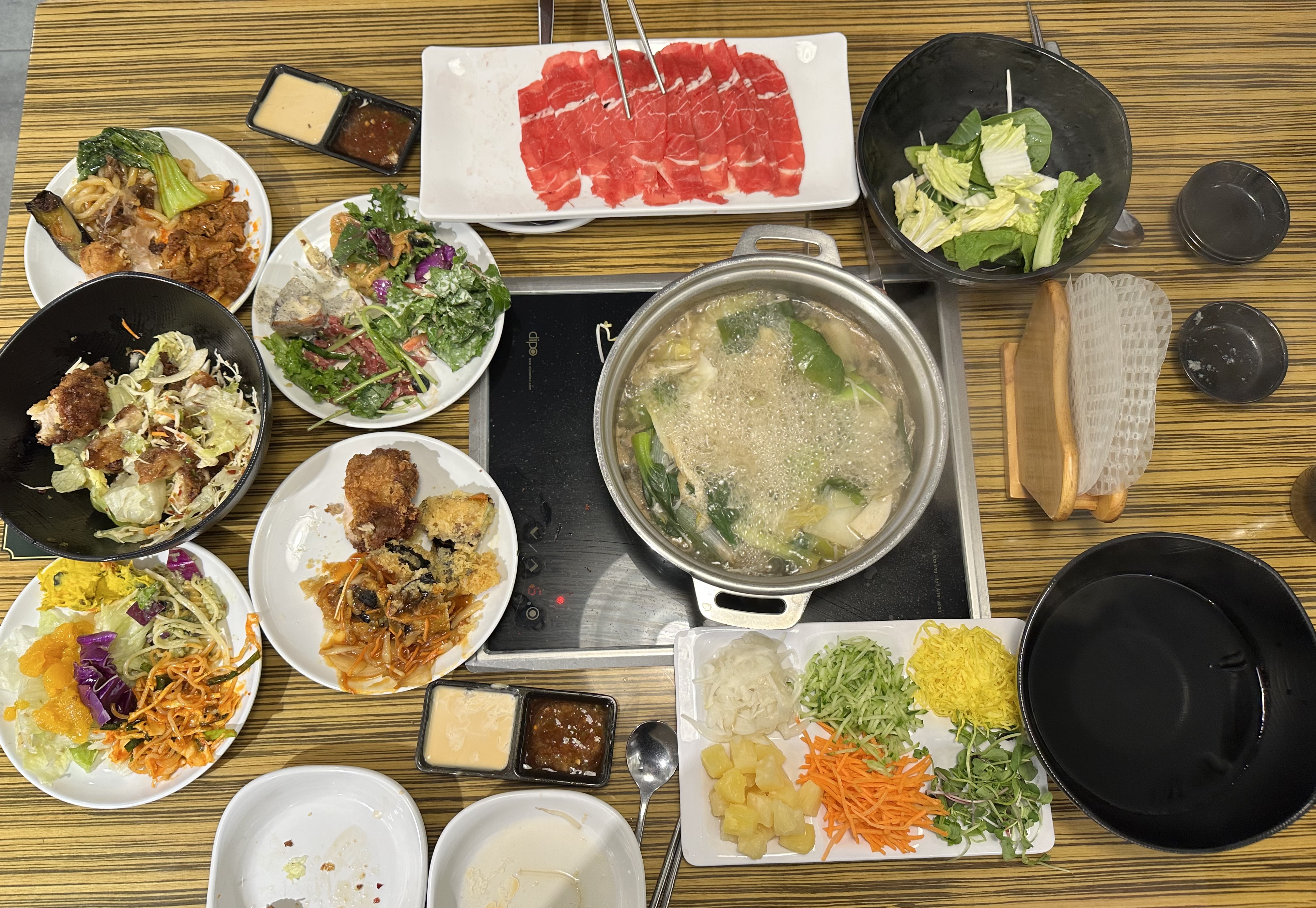 육수에 소고기를 샤샤샥 익혀 월남쌈에 싸먹고, 그 옆에서 즉석 튀김·피자·파스타·디저트까지 마음껏 가져다 먹는 구조.