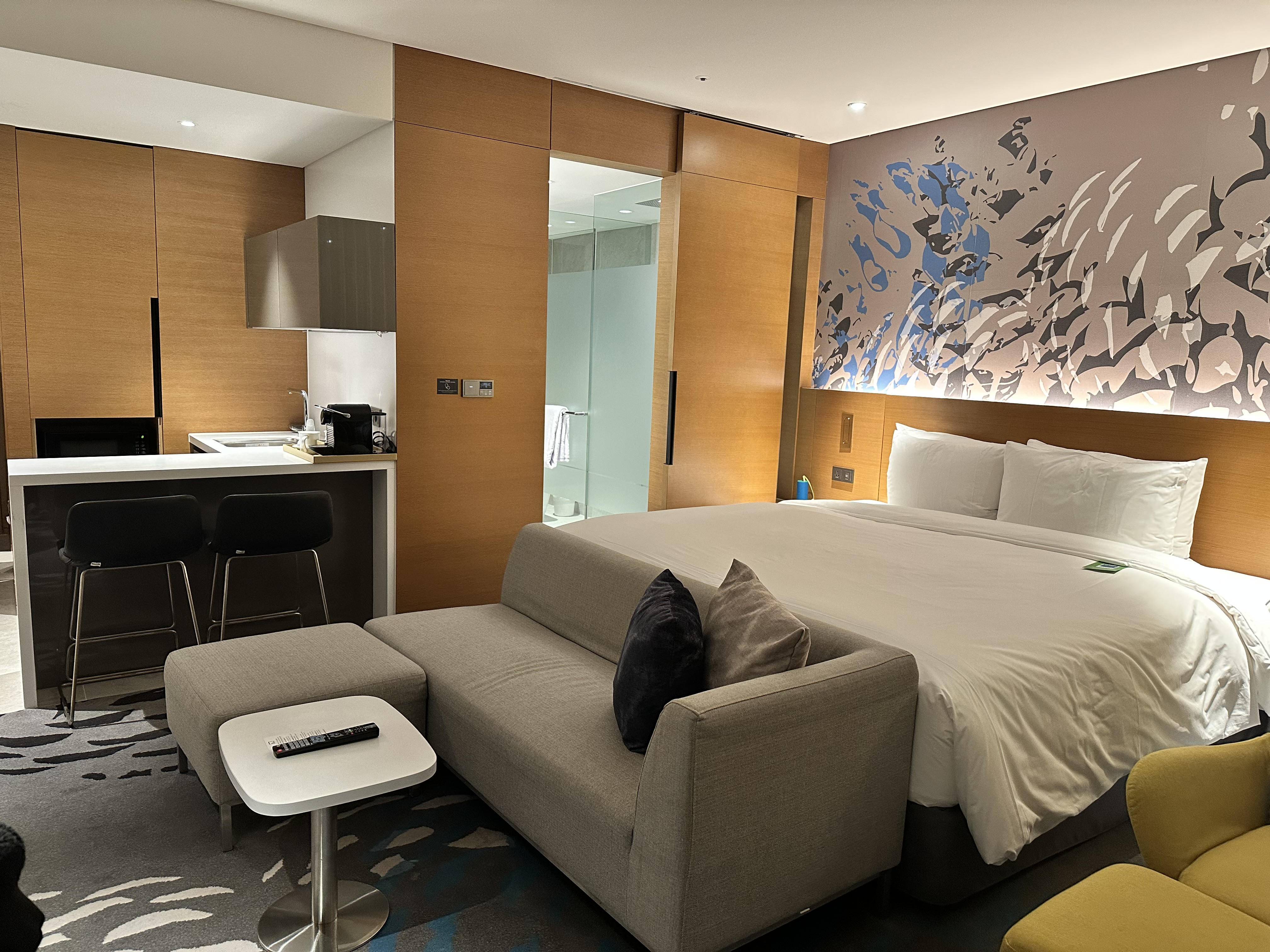 객실엔 싱크대, 전자레인지, 바 테이블도 있어서 간단한 배달 음식이나 와인 타임도 즐기기 딱 좋았어요.