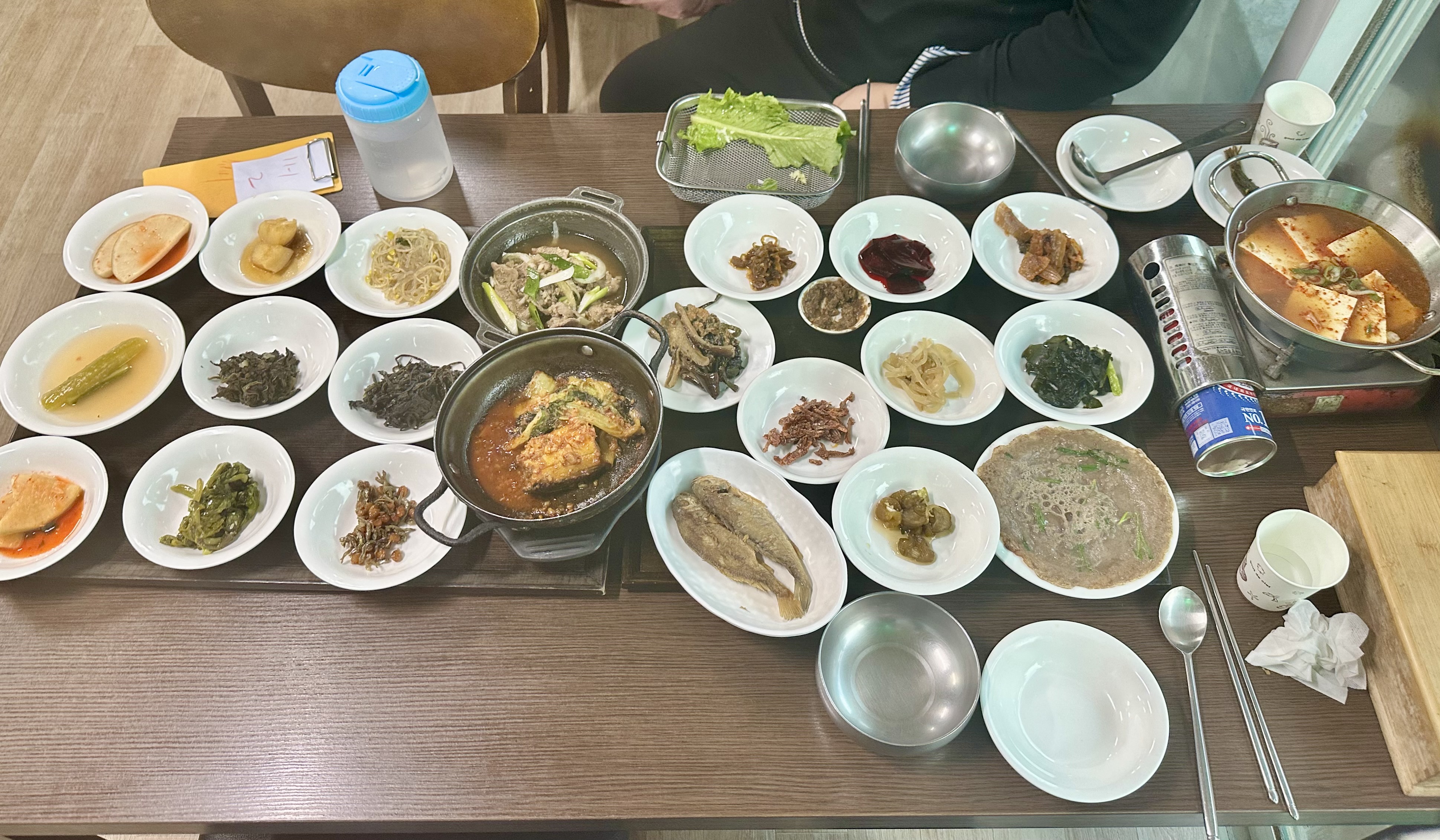 돌솥밥 + 두부찌개 + 생선조림 + 수십 가지 나물 반찬이 푸짐하게 차려집니다.