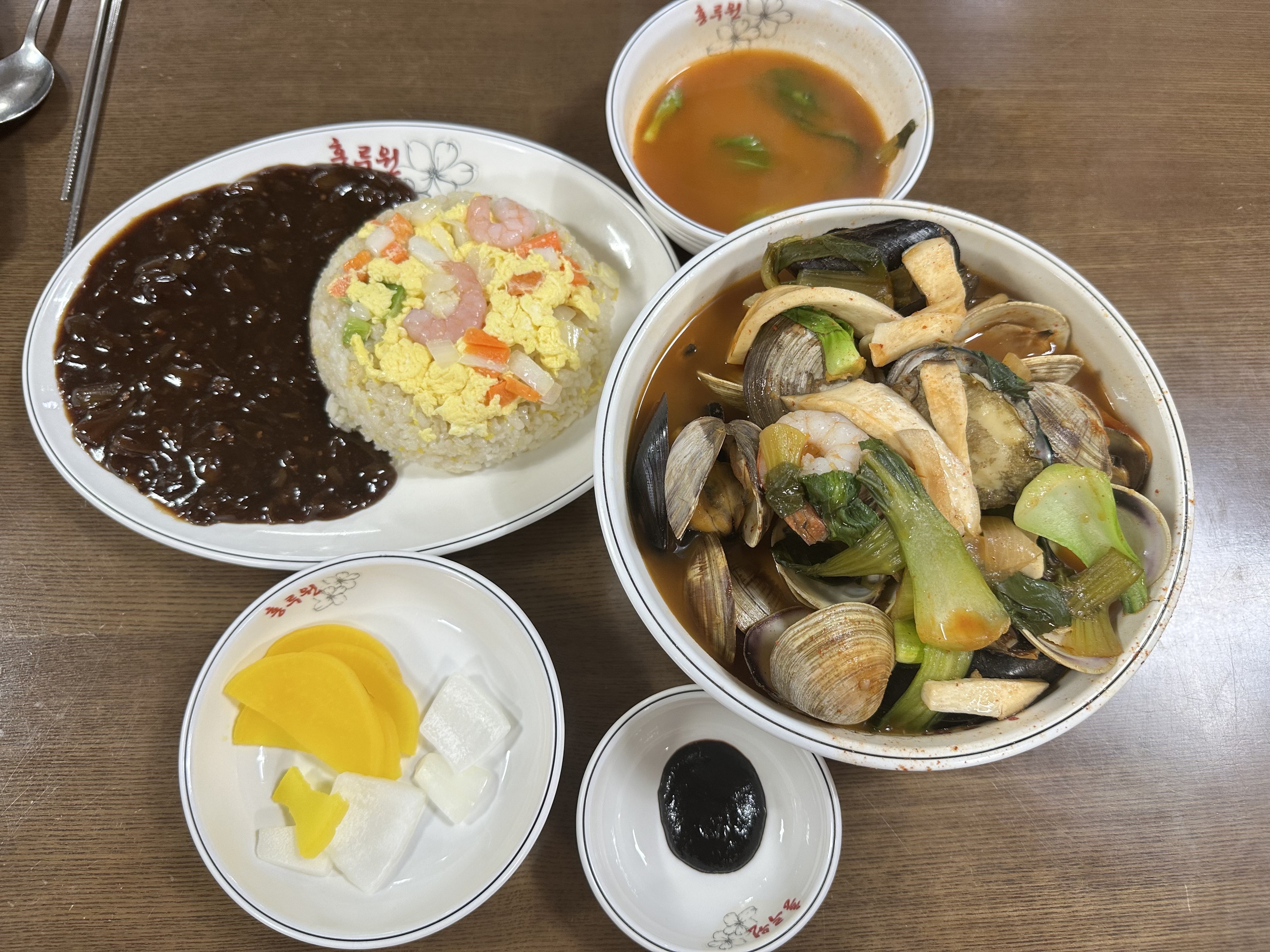 이 날 제가 주문한 메뉴는 해물짬뽕과 짜장밥이었어요. 짬뽕은 정말 조개가 가득 들어 있어서, 첫 숟갈부터 시원한 조개탕 국물 느낌이 났습니다. 전복은 없었지만, 해산물 자체는 꽤 신선했고 국물도 자극적이지 않아 좋았어요.