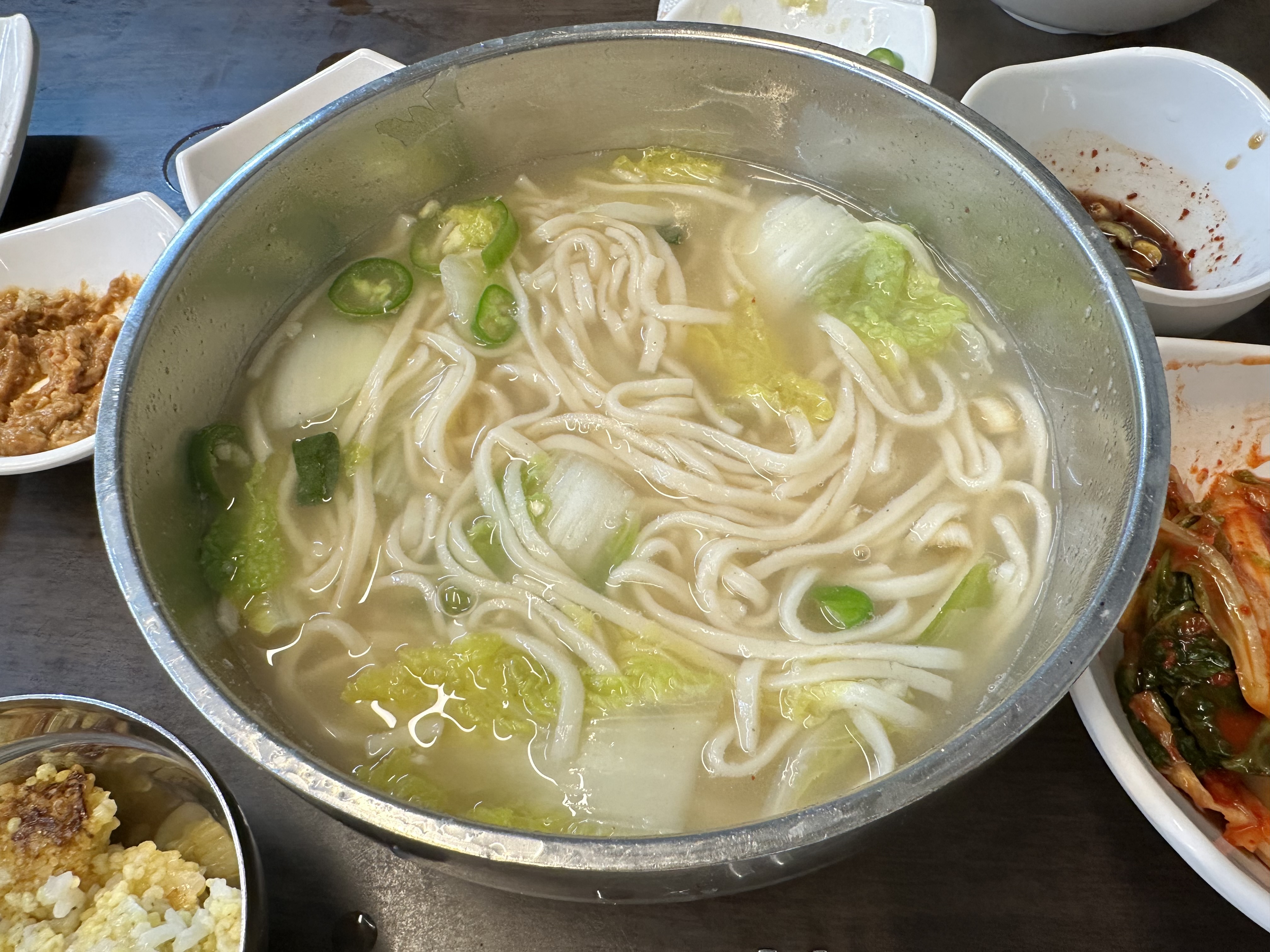 우리는 손국시, 배추전, 보쌈을 주문했어요. 먼저 손국시는 국물 맛은 정말 깔끔하고 담백해서 좋았지만, 면이 일반 칼국수와는 좀 달라서 생소하고 호불호가 갈릴 수 있는 식감이었어요.