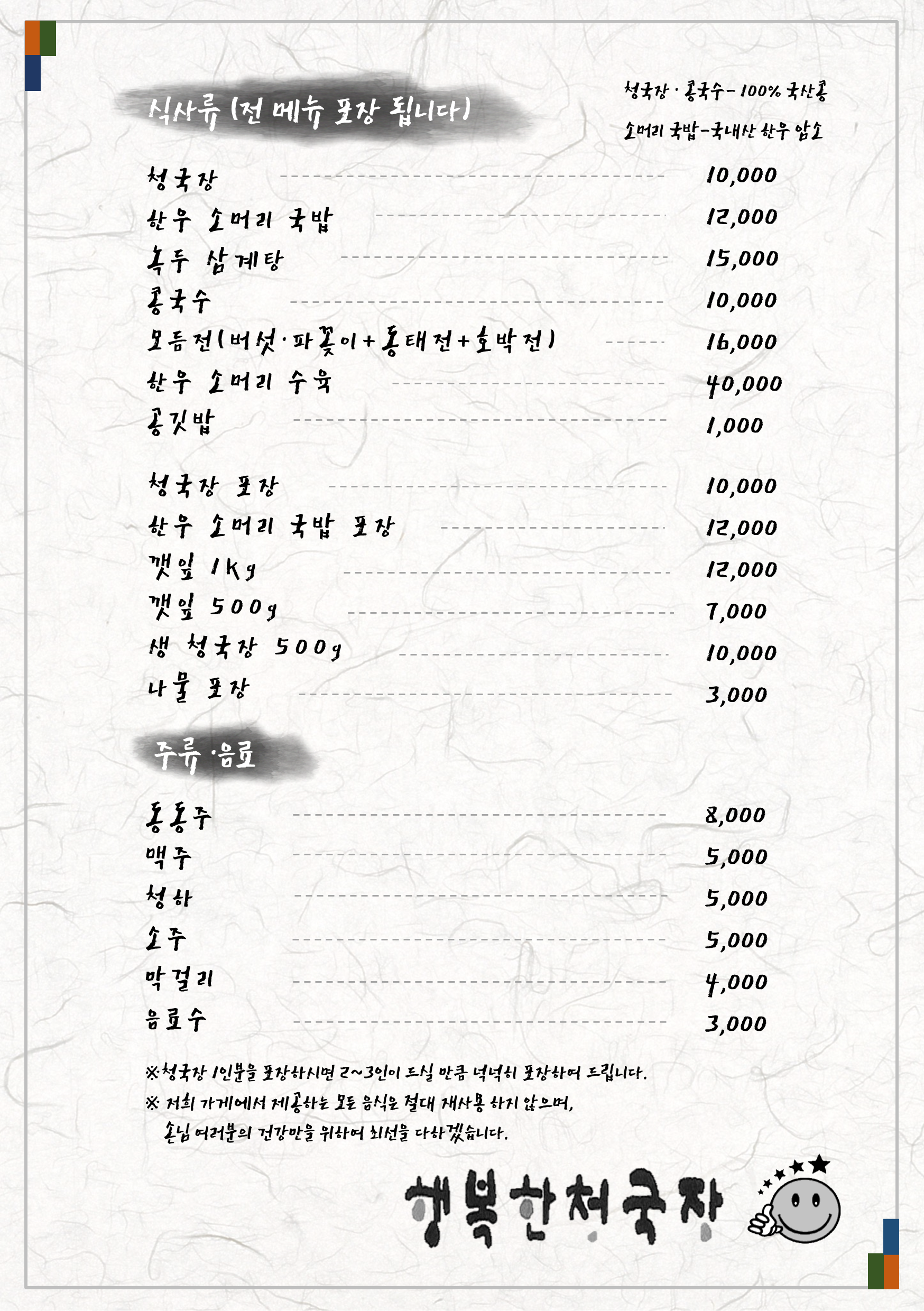 오늘은 송파 오금역 인근, 깔끔하고 구수한 한 끼 식사가 가능한 ‘행복한청국장’ 후기를 소개해드릴게요. 가끔씩 청국장 생각날 때, 몸이 좀 허할 때, 그리고 따뜻한 집밥이 먹고 싶을 때 자주 들르는 곳이에요. 입구부터 풍기는 구수한 냄새에 벌써 한 끼 제대로 할 기분이 든답니다.