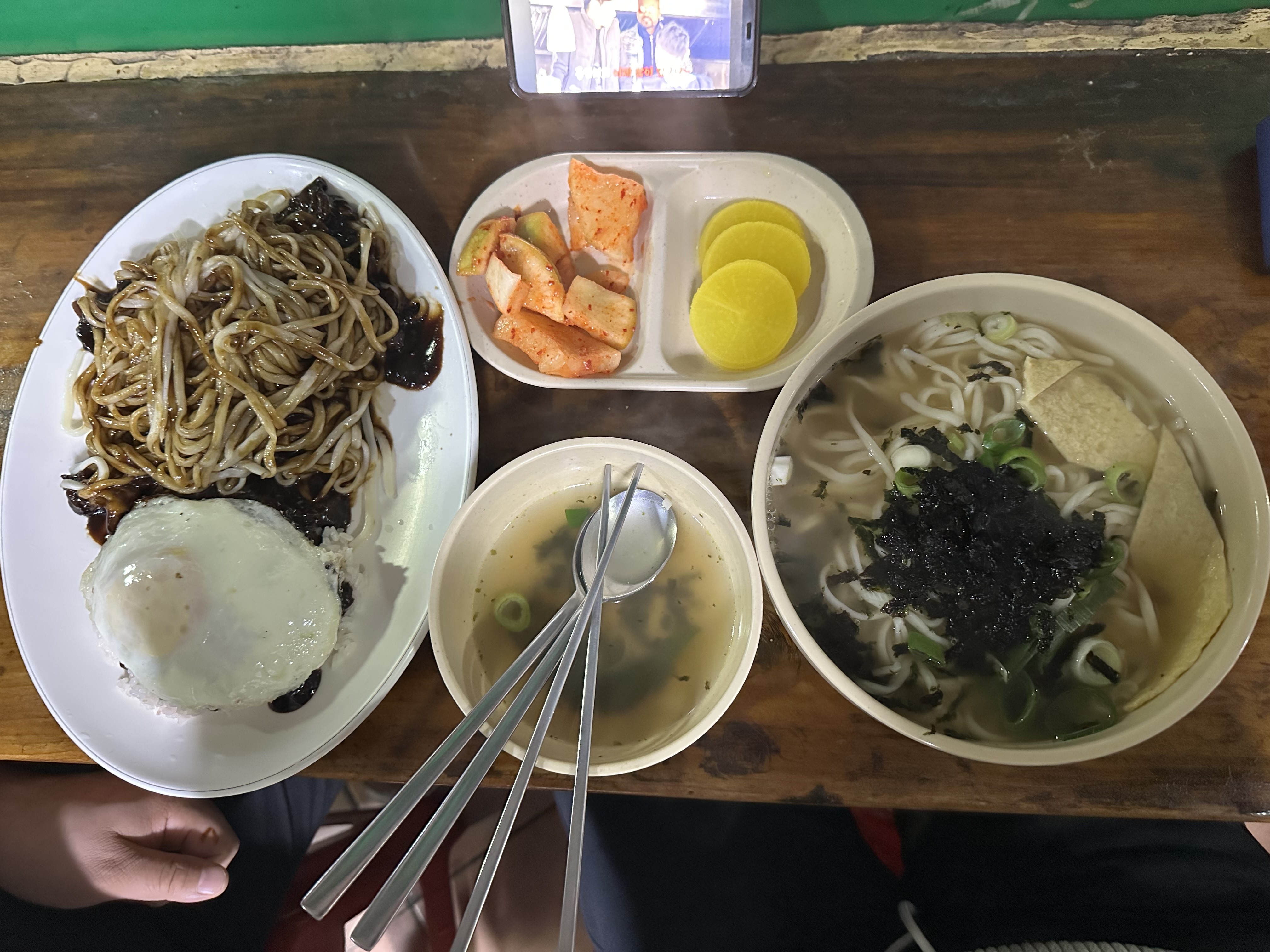 제가 주문한 메뉴는 오뎅우동과 짜면밥. 우동은 국물도 면도 아주 맛있어서 만족스러웠고, 따끈한 오뎅이 한 입에 피로를 녹여줬어요. 하지만 짜면밥은 제 입맛엔 너무 짜서 조금 아쉬웠습니다.