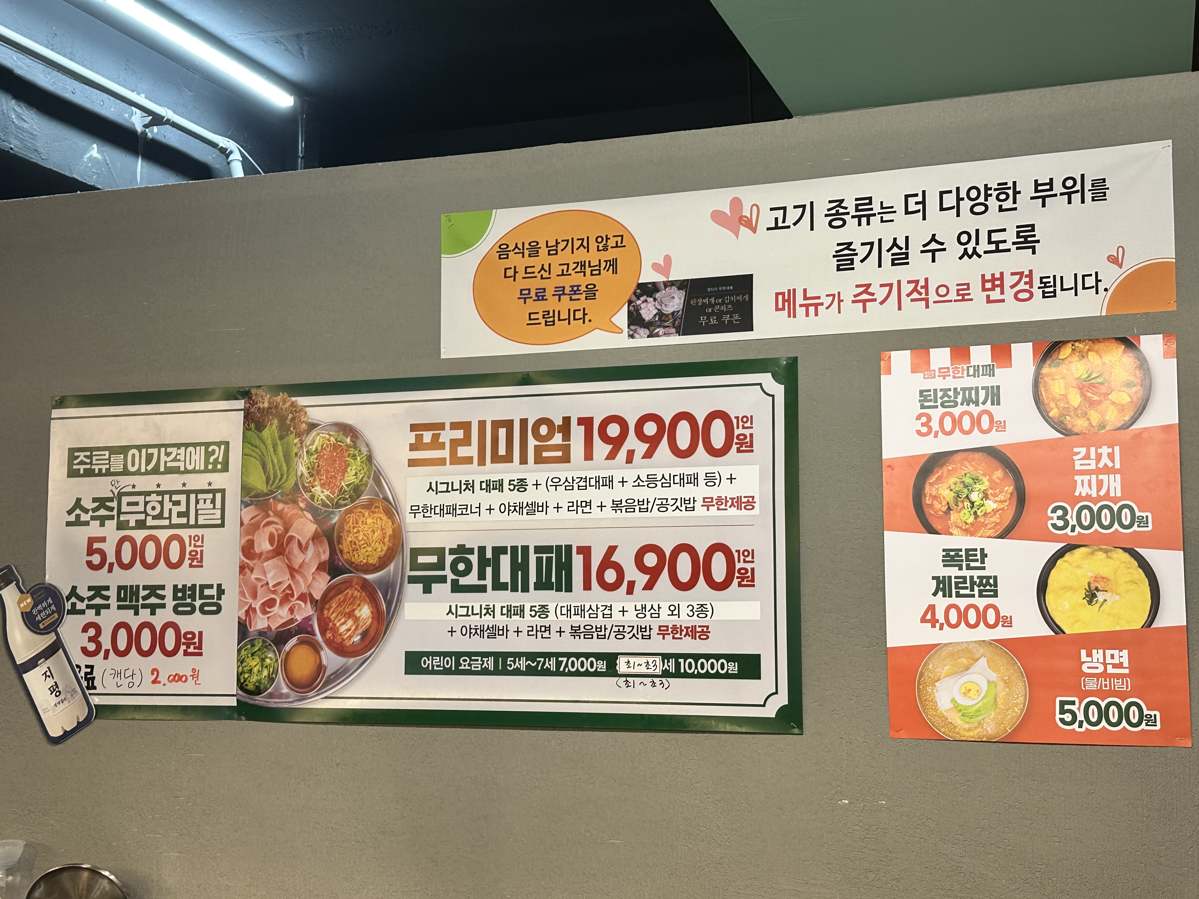 - 무한대패 고기 뷔페: 1인 16,900원 (대패삼겹, 목살 등 포함)