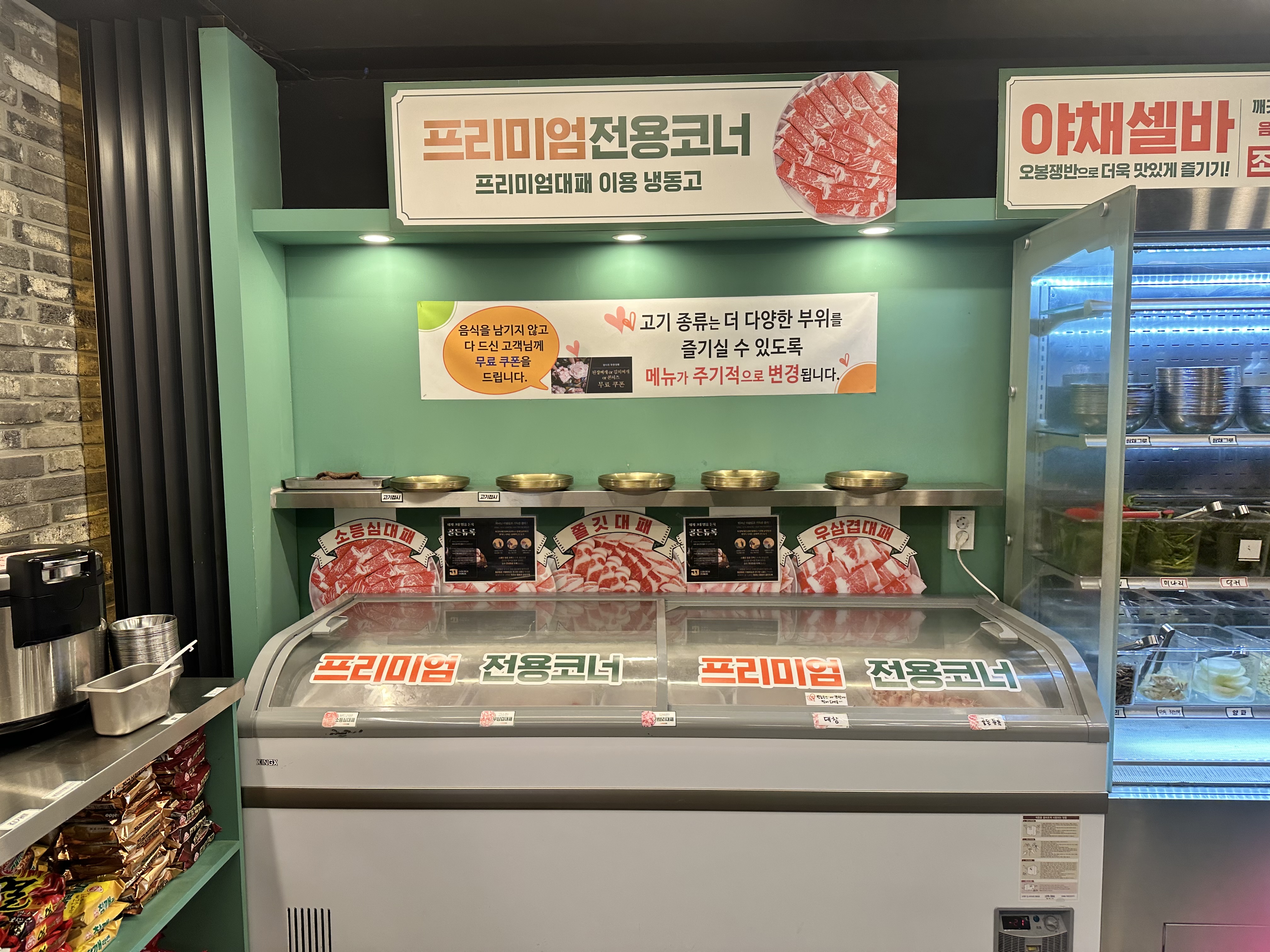 프리미엄 무한대패는 소고기 종류가 있는 코너도 함께 이용가능하고, 일반 무한대패는 돼지고기 종류만 이용하실 수 있어요!