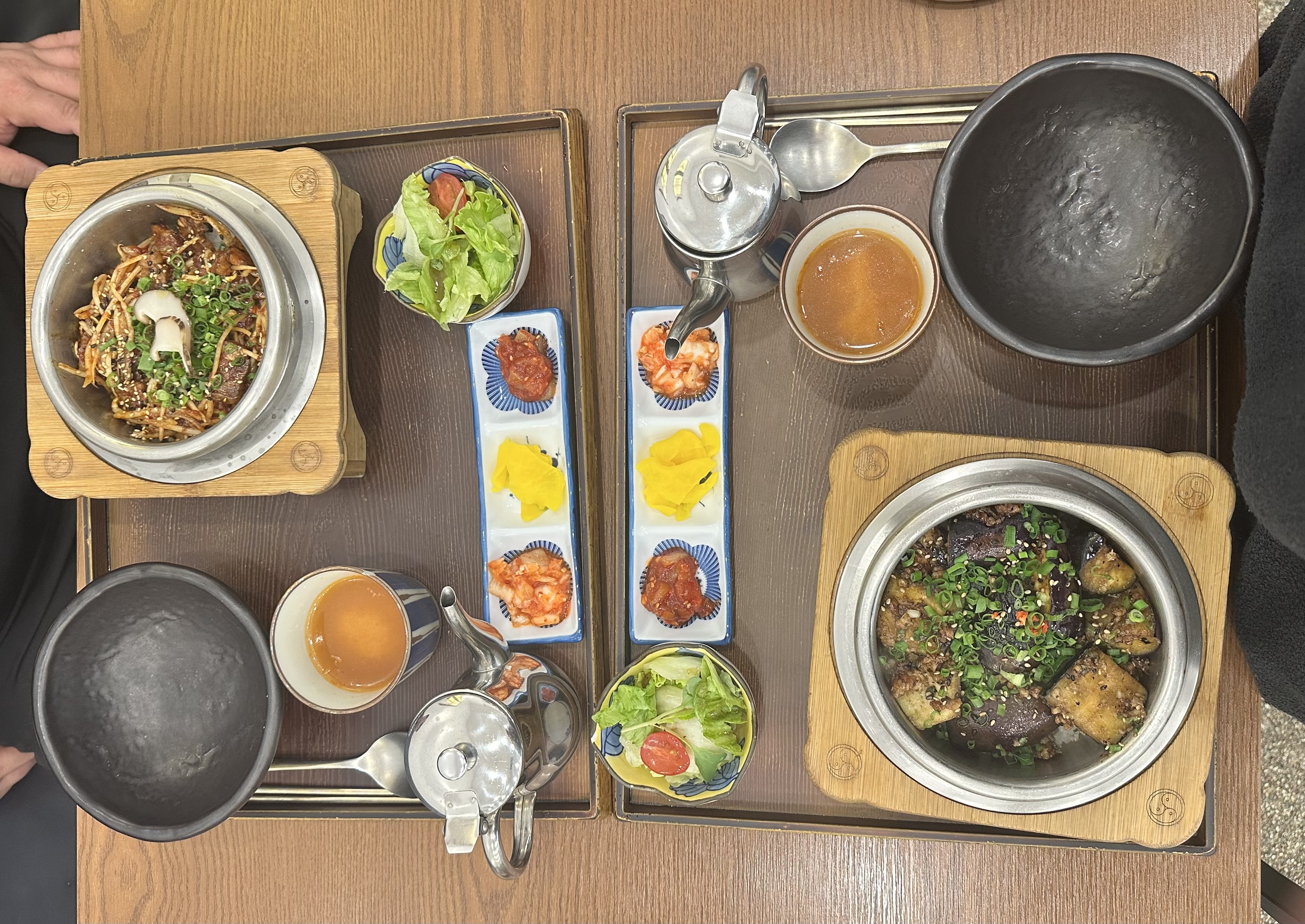 **가지 솥밥과 돼지고기 숙주볶음 솥밥을 주문**했는데, 반찬과 함께 제공되어 전체적으로 정갈한 느낌이었습니다. **반찬을 곁들여 비벼 먹는 스타일**이라 기존 덮밥과는 다른 식감이었어요.