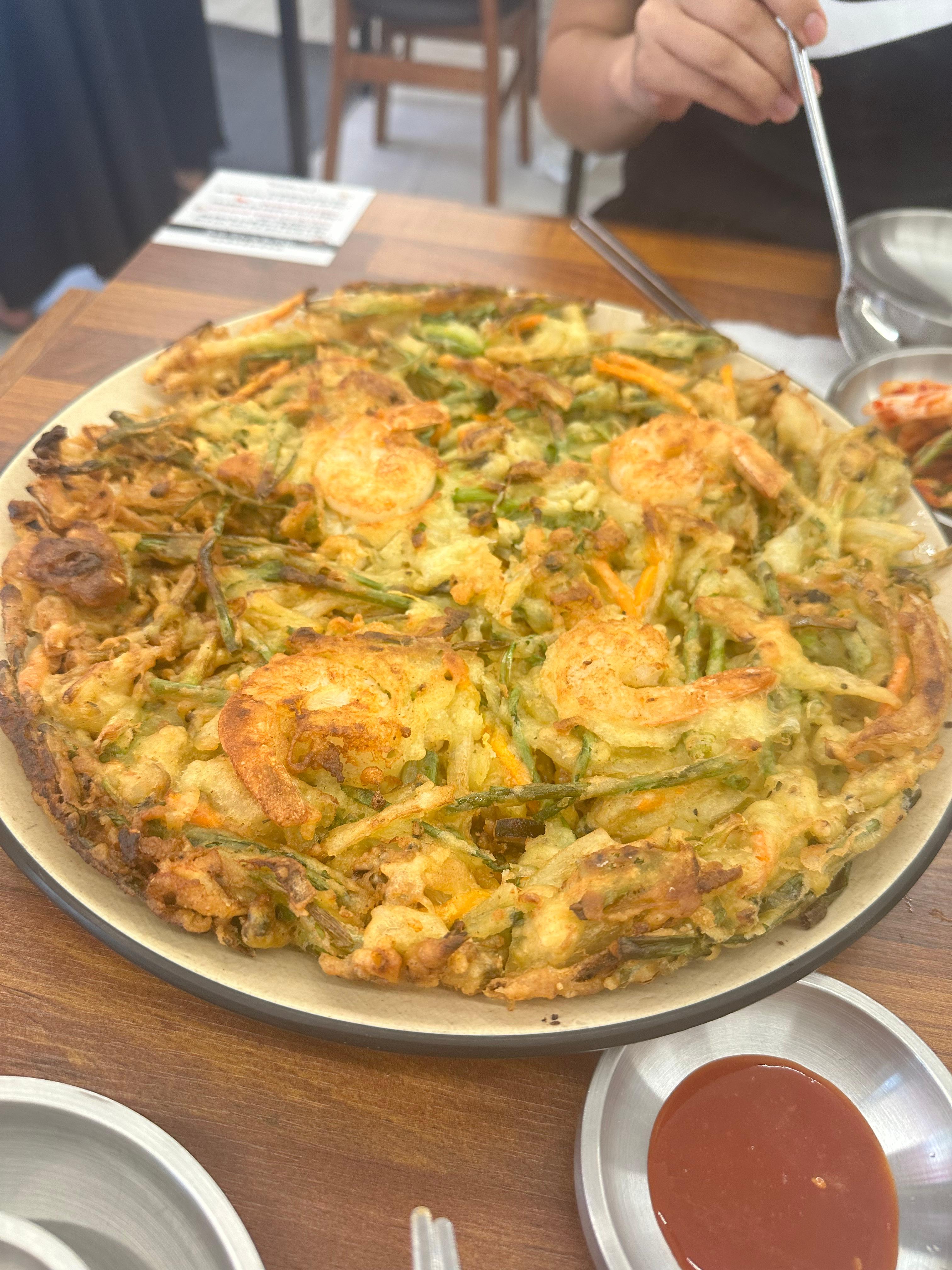 해물파전은 겉은 바삭, 속은 촉촉하고 해물이 고루 들어 있어 술안주나 식사 모두 훌륭합니다.