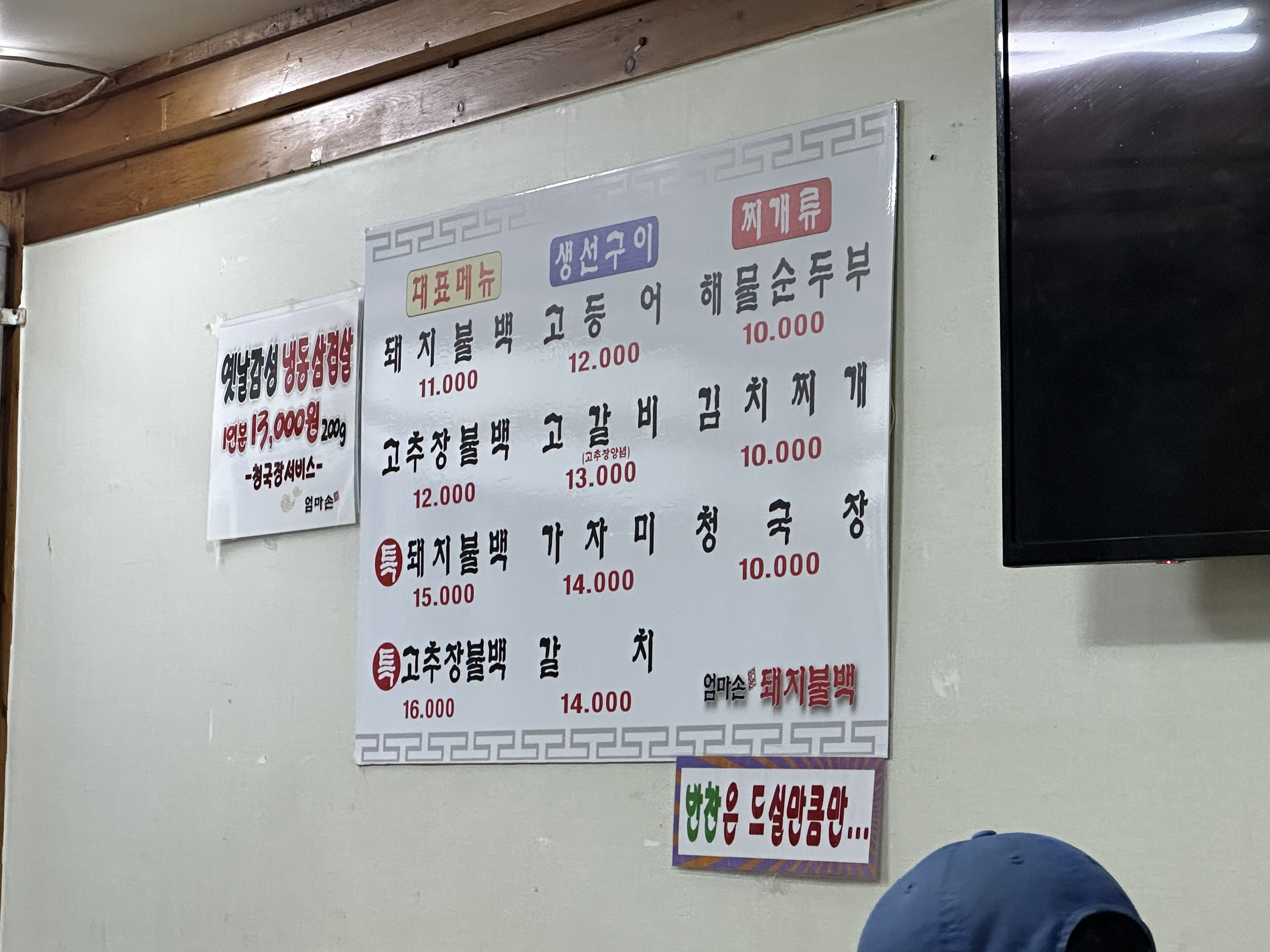 | ๋ํ ๋ฉ๋ด | ๋ผ์ง๋ถ๋ฐฑ, ๊ณ ์ถ์ฅ ๋ถ๋ฐฑ, ์ฒญ๊ตญ์ฅ, ๊ณ ๋ฑ์ด๊ตฌ์ด |